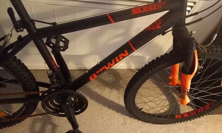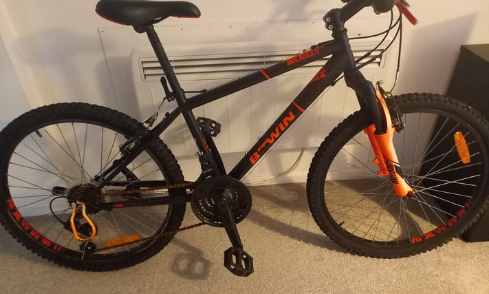 BTWIN mountain bike rockrider500 ? Durable frame with front suspension ? Multi-speed gearing for versatile riding ? V-brakes 24″ wheels, Suitable for ages 8-12 £ 95 Good condition 07387956303 Email Me
