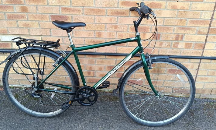 Professional Hybrid bike in good condition with new brake pads, rear rack carrier, mudguards, bell and front reflection. Wheel size is 28", 6 gears, 19" frame. £90 Email Me