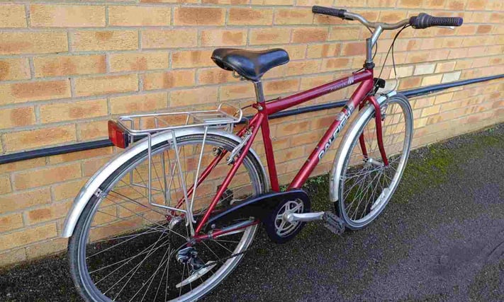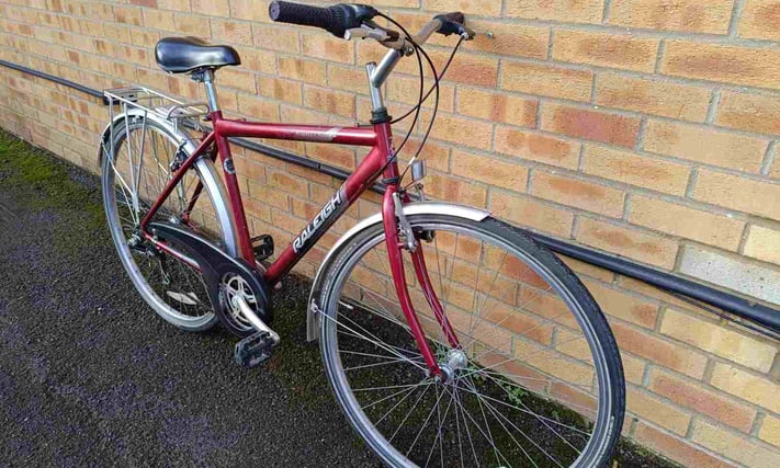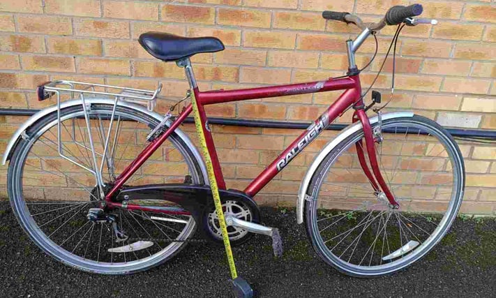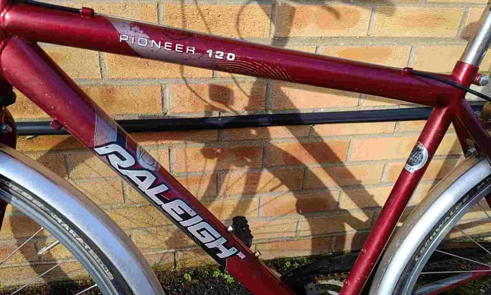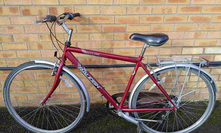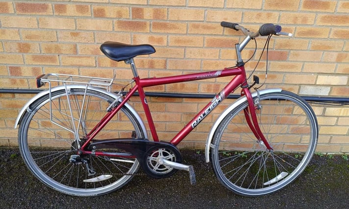 Raleigh 120 Pioneer Hybrid bike with good reflective tyres, rear rack carrier, mudguards, kickstand and bell. Frame size is 19", 6 speed gears, wheel size is 28". £140 Email Me
