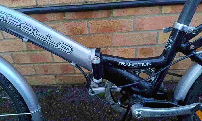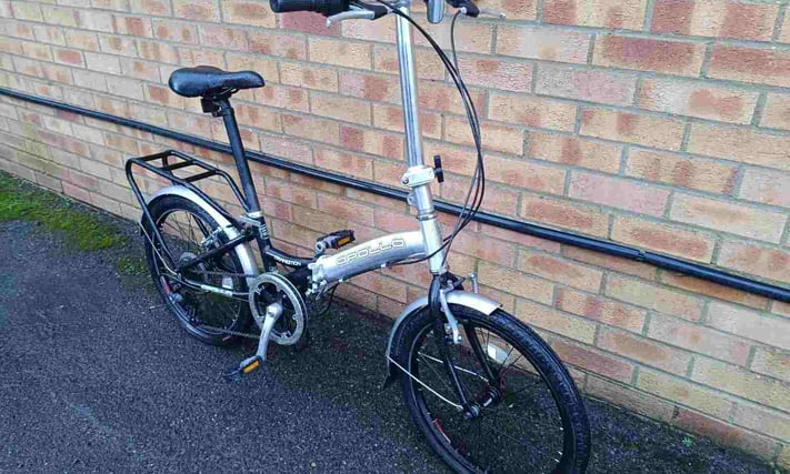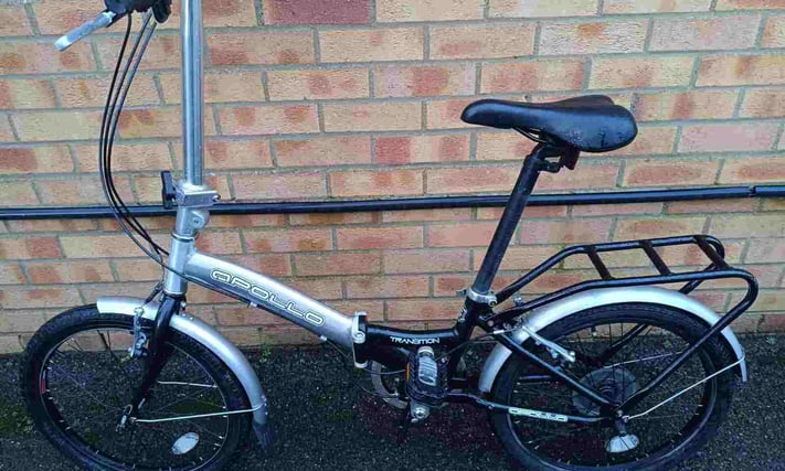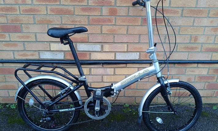 Aluminium Apollo Transition folding bike with mudguards, rear pannier rack, folding pedals and bell. The wheel size is 20" with good tyres. Shimano 6 speed gears. £130 Email Me