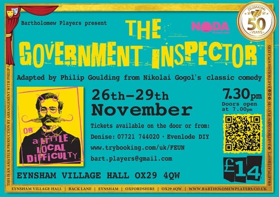 What an astonishing spectacle met the eye as the curtain rose for the second Bartholomew Players 50th anniversary production! Expecting the drab muted colours of the backwoods nineteenth century Russian location in which Gogol’s play was originally set, I was jolted into a reappraisal of what lay ahead, by interior walls painted a particularly nauseous shade of bright green, and a character in a large Santa-style gown with a towering red wig boasting the sort of ribbons and bows that Cinderella’s Ugly Sister would be proud of.