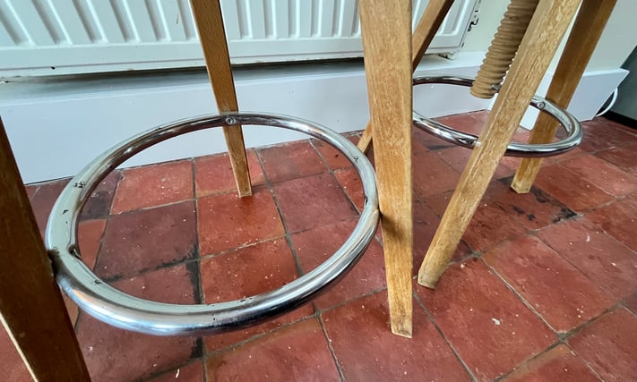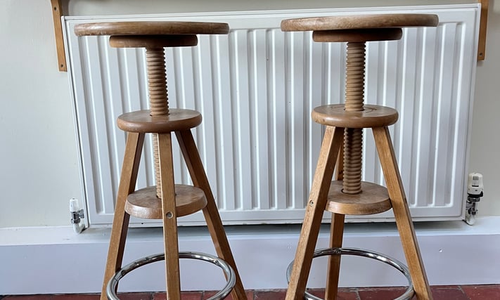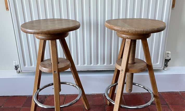 Two wooden kitchen/bar stools, height adjustable. Birch finish with circular chrome footbar. Height 64cm (min) / 78cm (max). Similar retail for £50 each. Collection Headington. Delivery considered for small fee. Email Me