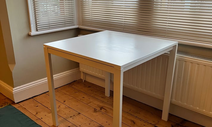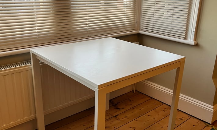 IKEA Meltorp Table, 75cm x 75cm x 74cm H. Metal Legs, Melamine Top Ideal as desk. Excellent condition. Legs detach. Collection Headington. Delivery considered for small fee. Email Me