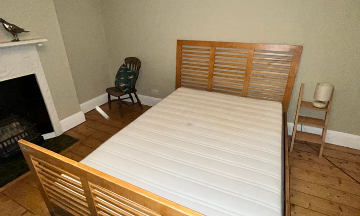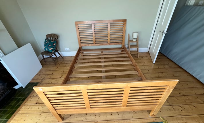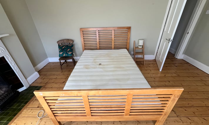 Wooden Double Bed. IKEA Mattress Used. Marks / scratches but very solid. 204cm (L) x 146cm (W). Headboard 109cm and footboard 77cm (H). Dis-assembles. Collection Headington. Delivery considered Andrew 07540 257397 Email Me