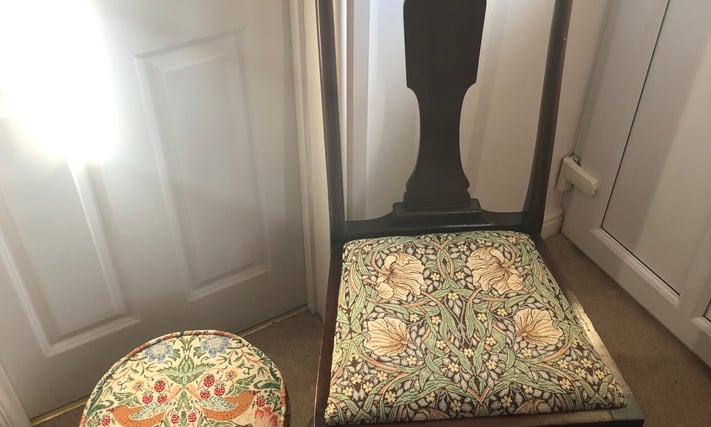 Vintage chair and stool high backed chair with bull dog legs and circular stool both freshly upholstered with William Morris fabric £100 collect or can try to deliver Email Me