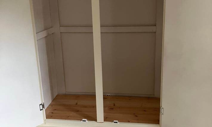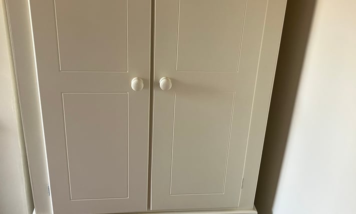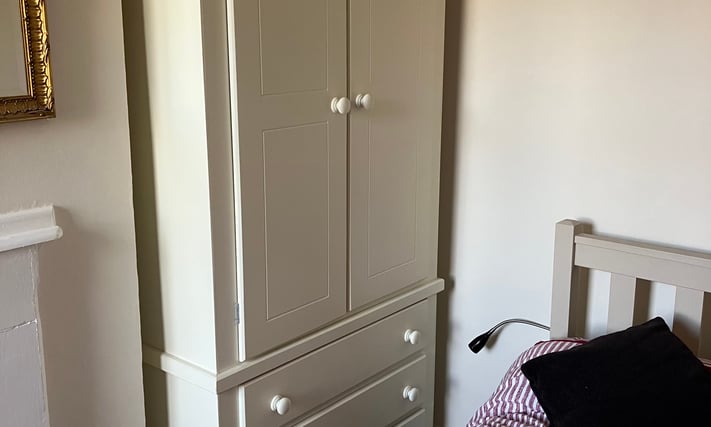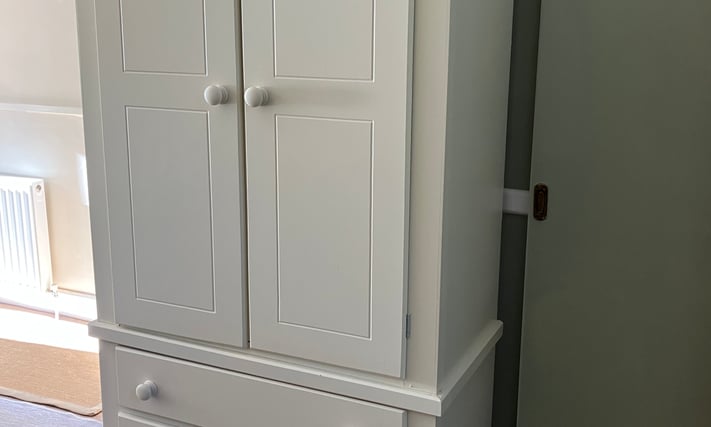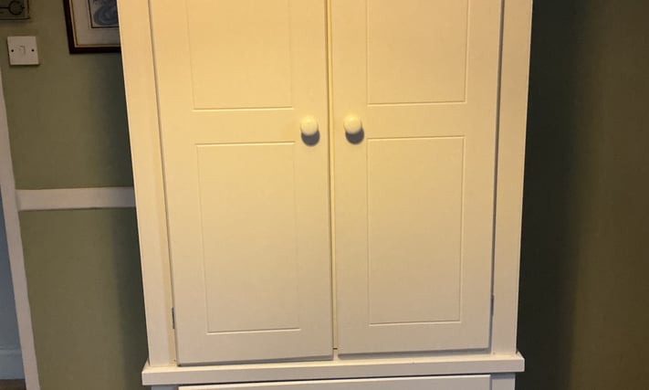 Double wardrobe with three drawers. Splits into two sections. Cream. Little use. Excellent condition. H200 W99 D53cm. Email Me