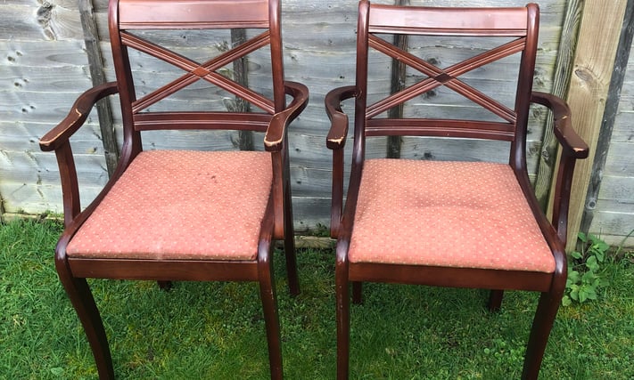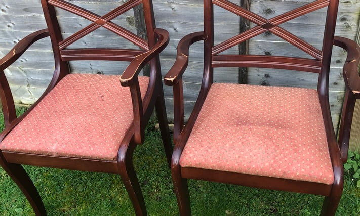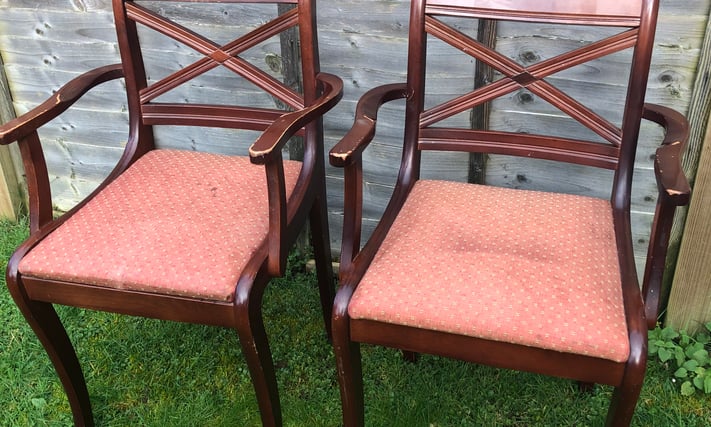Pair dining chairs with arms two hardwood framed dining chairs with upholstered seats solid chairs in good condition £40 collection or l can try and deliver 07955289492 Email Me