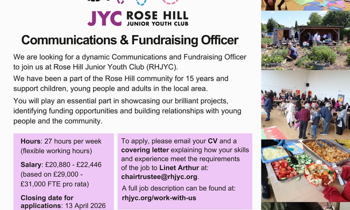 Searching for your next opportunity? We are looking for a dynamic Communications and Fundraising Officer to join us at Rose Hill Junior Youth Club (RHJYC). Full spec: rhjyc.org/work-with-us/ Email Me