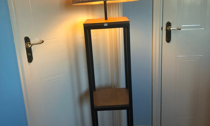 floor shelf lamp metal frame size 110 cm tall with wooden shelves and remote foot switch electrically tested £25 collect or can try to deliver Email Me