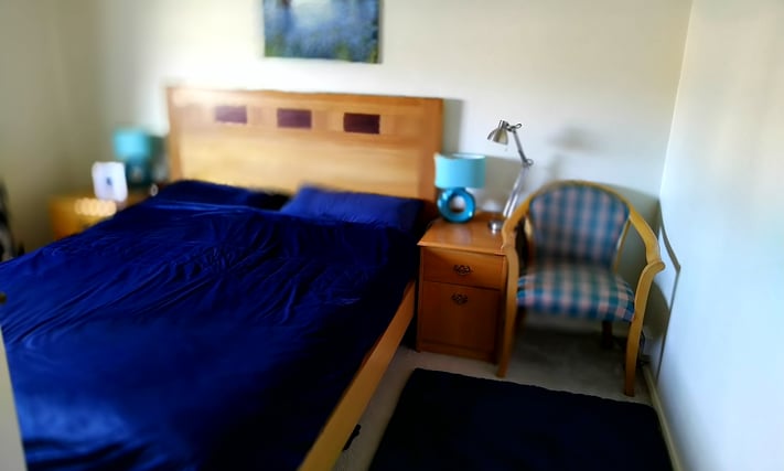 The room has a double bed, two side tables, wall mounted mirror, chair, book shelf and in built wardrobe.
